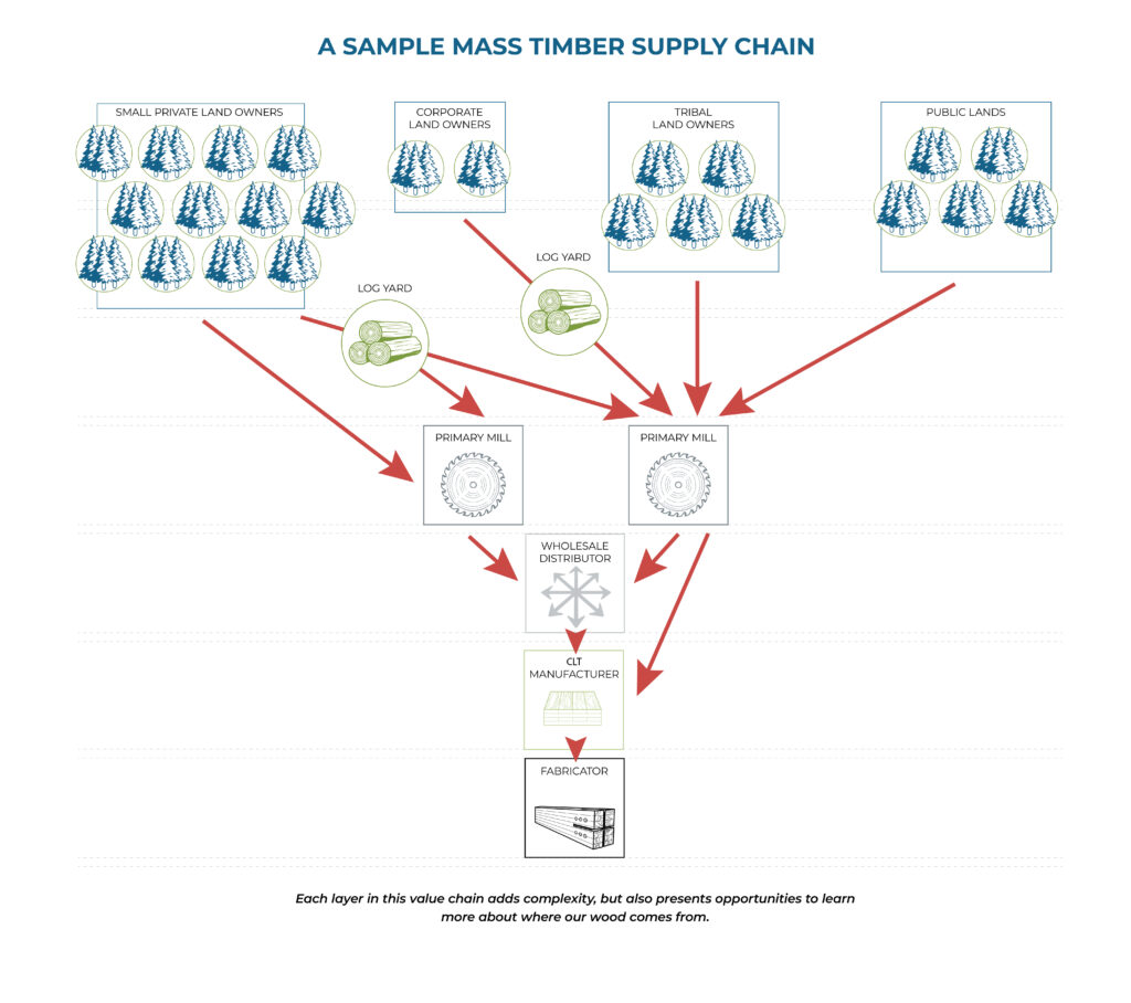 Figure 1 below depicts a relatively simple case where logs from a variety of landowners are processed into lumber by two sawmills and pass through additional value chain steps to be made into mass timber. A more complex illustration of wood product supply chains can be found in figure 2 in the section on disclosure.