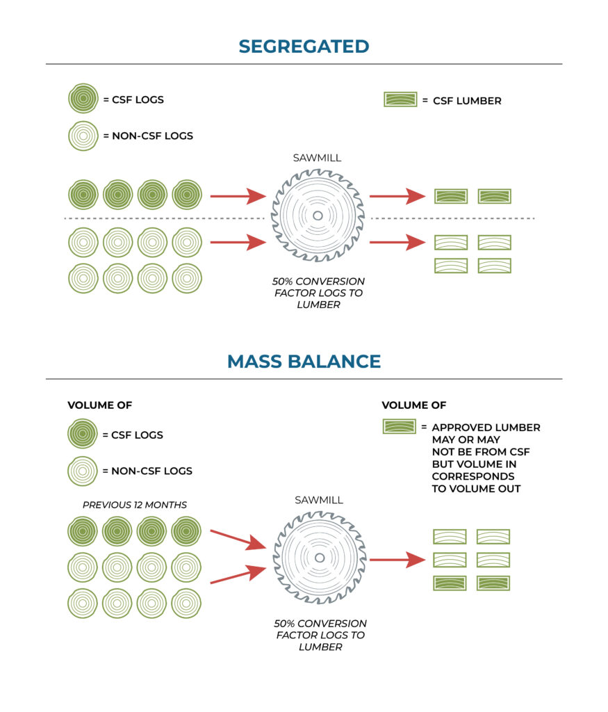 - Mass Balance: Another, generally more practical way to reward landowners who practice CSF without relying on segregation is to take a mass balance system approach. This is a volume in/volume out method where a primary manufacturer is asked to provide documentation showing that they have procured enough logs from a given source over a fixed time period – e.g., 12 or 24 months – to “cover” the volume of product needed for a project. Greater certainty about the actual sources can be achieved by aiming for tighter production windows. This method can also be applied at the secondary manufacturing level. For example, if it is inefficient for a mass timber manufacturer to segregate material that has been approved by the project team either because it stems directly from a selected landowner via segregation at the sawmill level or because it has been supplied through a mass balance system at the sawmill, the mass timber manufacturer could provide purchase documents showing that they procured enough lumber from the sawmill in a designated time period to “cover” what is needed for them to produce the package. While using a mass balance approach breaks the direct connection between the product and the source forest, it still represents a basis for credible claims about what kinds of landowners and forestry practices the project supported. As noted above, many products certified under forest certification systems are manufactured using this method because it is more efficient and less costly than segregation. Although this approach is indirect in that you cannot claim where the actual wood in your project is coming from, it is still a way to reward CSF producers financially and sends a positive market signal about what clients and project teams value.